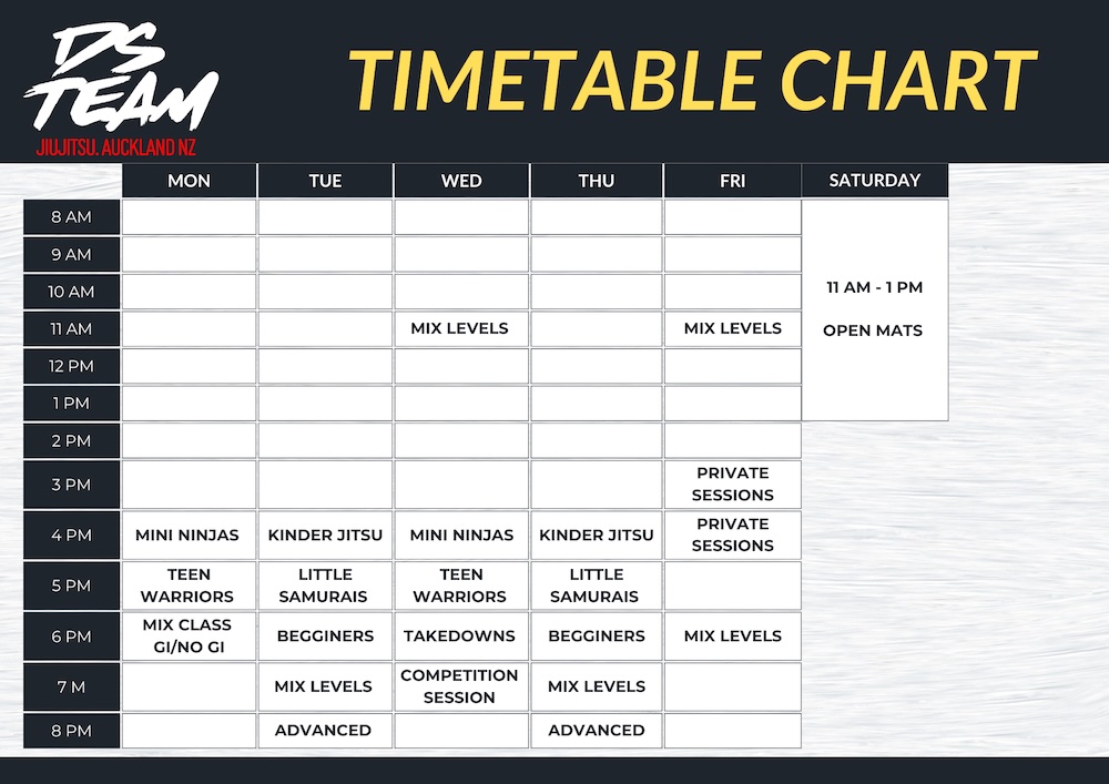 Our school is open 6 days a week. Use the timetable below to find the best schedule for you.